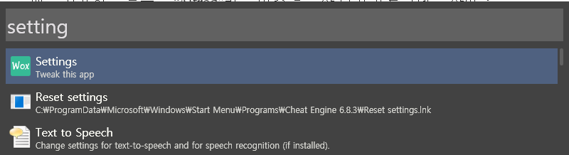 Settings라고 입력해보세요. 아래와 같이 나오면서 Wox의 설정화면을 여실 수 있습니다.