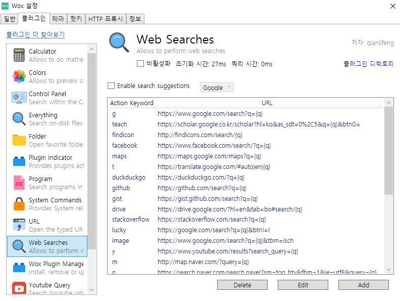 Action Keyword는 실행 명령어이고 URL을 자세히 보시면 {q}로 끝나는 것을 알 수 있습니다. query의 약자로 각 사이트마다 검색어를 입력한 주소라고 생각하시면 되겠습니다.